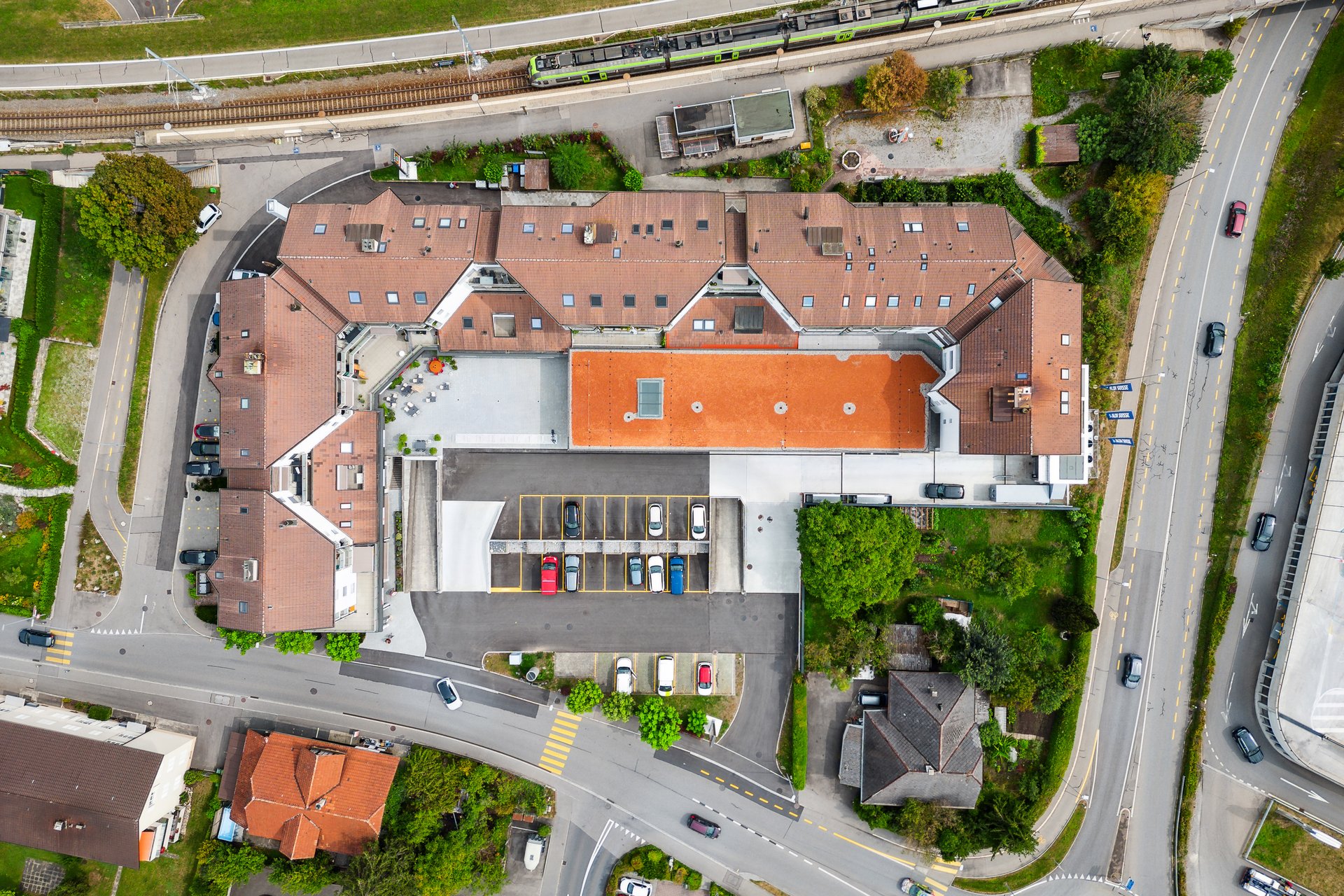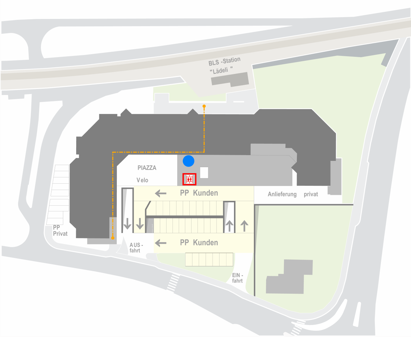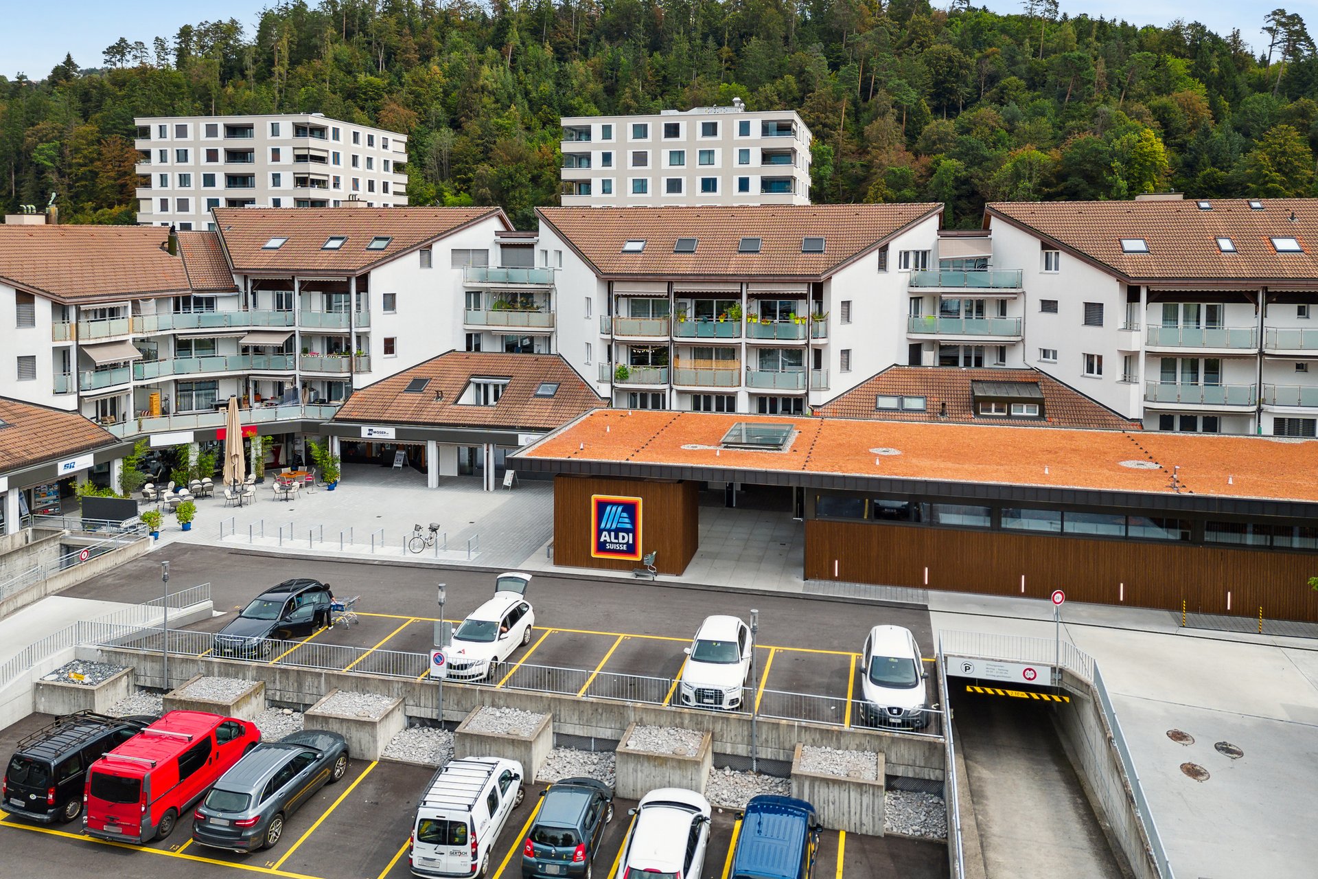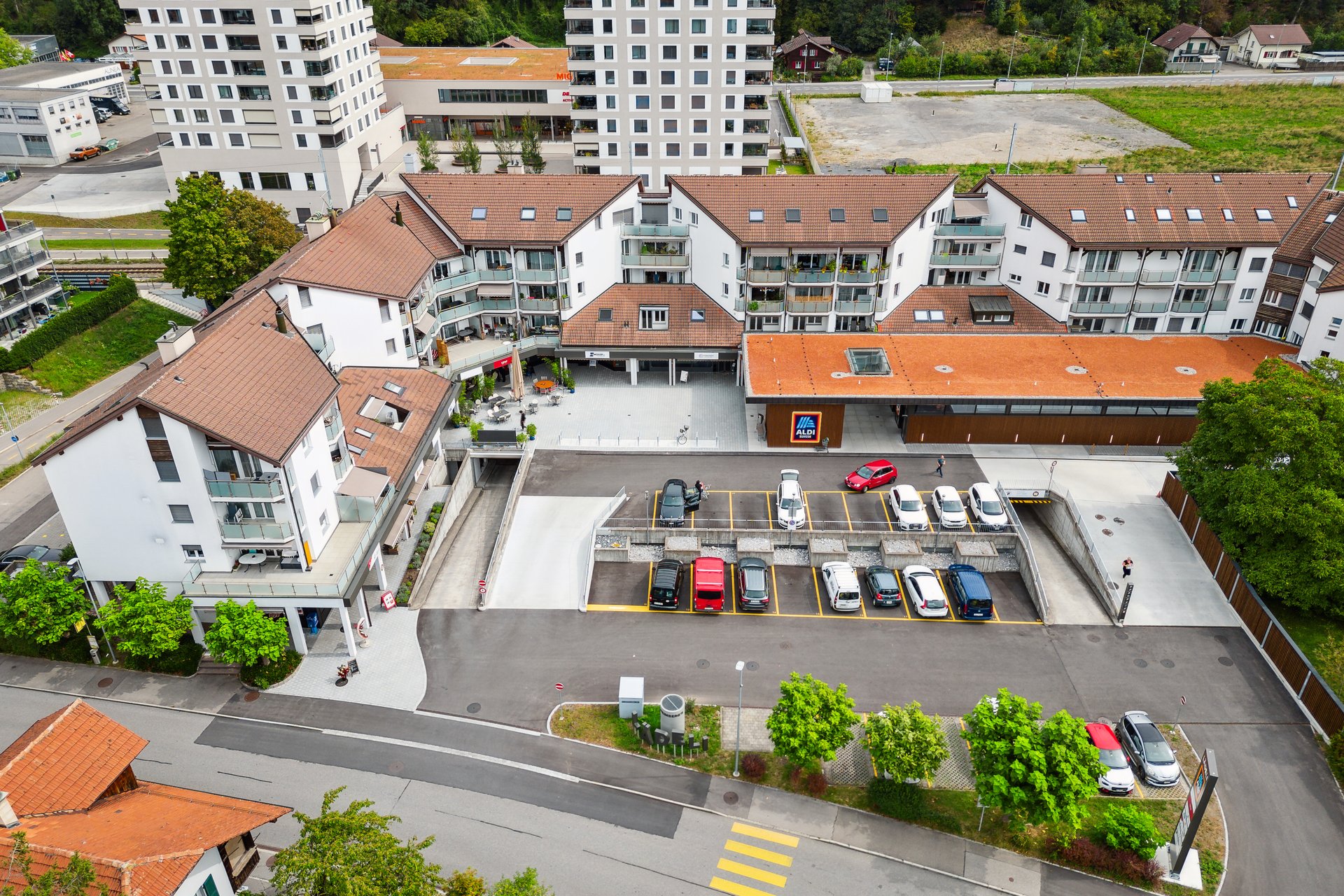 Die öffentlichen Parkplätze befinden sich draussen sowie im 1. und 2. Untergeschoss in der Einstellhalle.